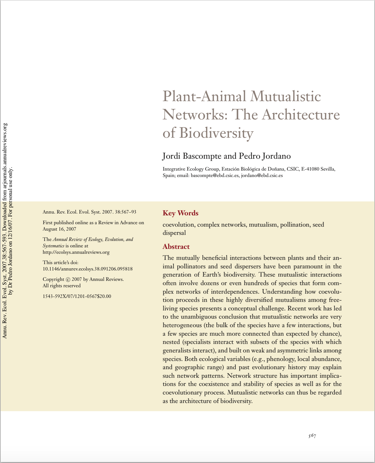 62. Bascompte, J. and Jordano, P. 2006. The structure of plant-animal mutualistic networks. In: Pascual, M. and Dunne, J. (eds.). Ecological networks. Linking structure to dynamics in food webs. Santa Fe Institute Studies in the Sciences of Complexity. Oxford University Press, Oxford, US. Pages: 143-159.