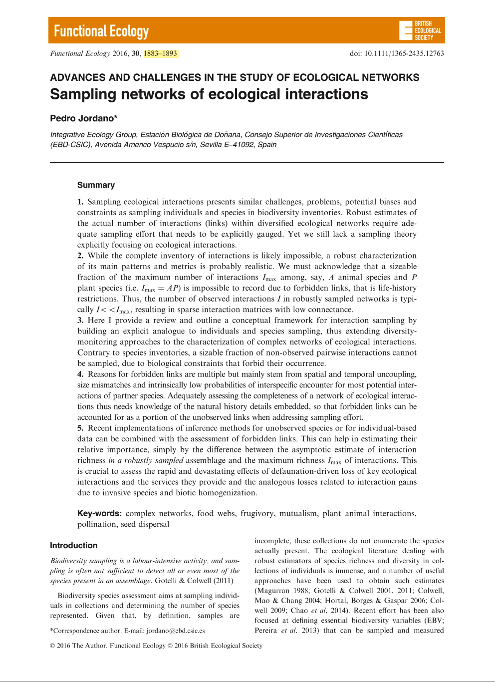 199. Jordano, P. 2021. The Biodiversity of ecological interactions: challenges for recording and documenting the Web of Life. Biodiversity Information Science and Standards 5: e75564.