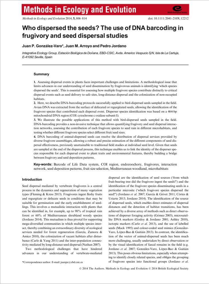 216. Quintero, E., Arroyo, J.M., Dirzo, R., Jordano, P. and Rodríguez-Sánchez, F. 2024. Lasting effects of avian-frugivore interactions on seed dispersal and seedling establishment. Journal of Ecology 112: 656-672.